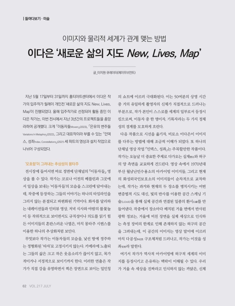 지난 5월 17일부터 31일까지 홍티아트센터에서 이다은 작가의 입주작가 릴레이 개인전 ≪새로운 삶의 지도 New, Lives, Map≫가 진행되었다. 올해 홍티아트센터 단기 입주작가로 선정되어 활동 중인 이다은 작가는, 이번 릴레이 개인 전에서 지난 3년간의 프로젝트들을 총망라하여 공개했다. 전시는 크게 <이동자들 Movers>(2023), <은유의 변주들 Variations In Metaphor>(2022), 그리고 대표작이라 부를 수 있는 <인덱스, 성좌 Index, Constellations>(2021)의 세 파트의 영 상과 설치 작업으로 나뉘어 구성되었다.