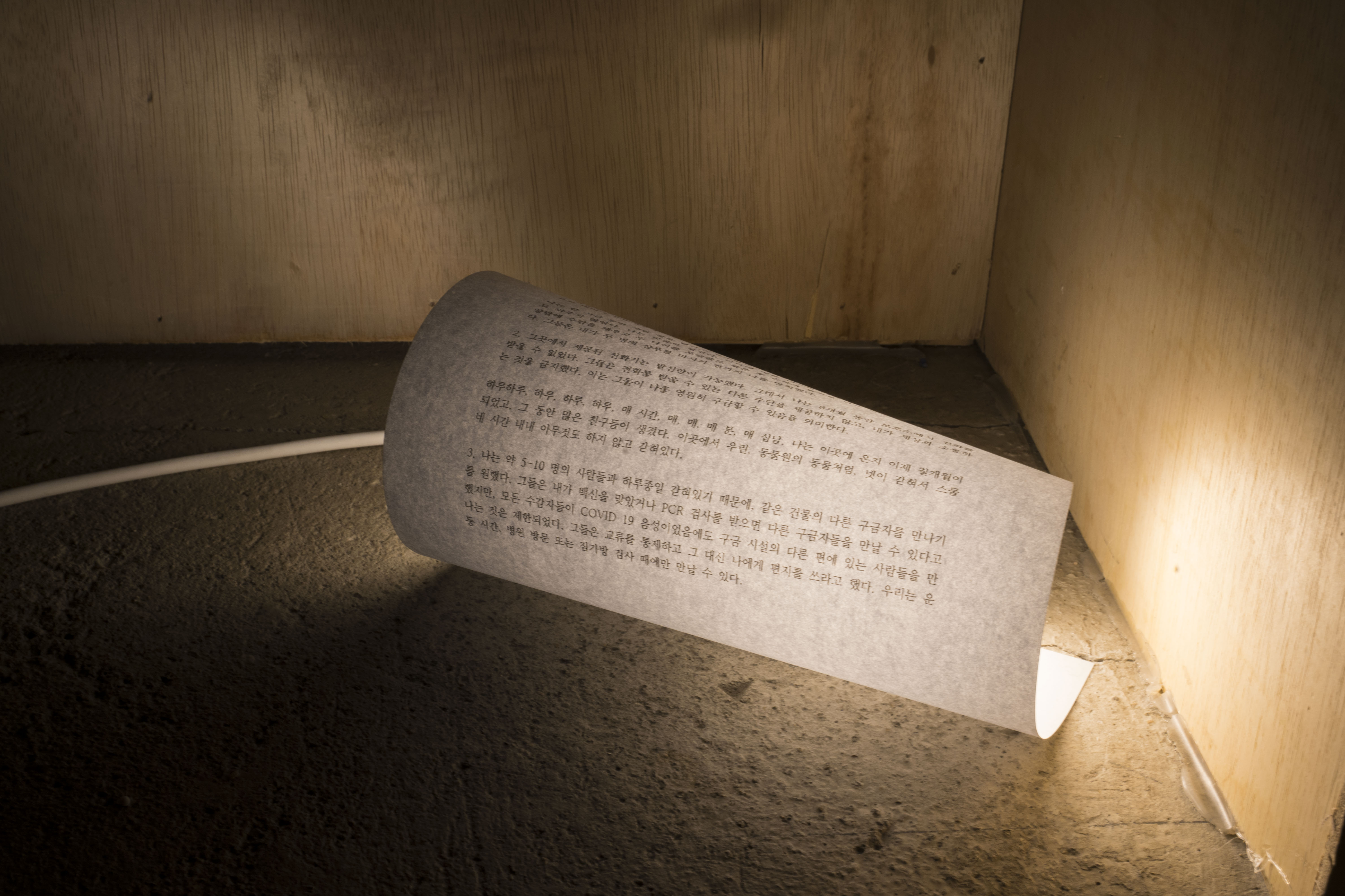 전시제목 ‘안개, 상자 입 Haze, Chamber, Lips’ 은 2021년 6월, 이 전시의 출발점이 된 한 장의 이미지가 잔상으로 남긴 파편적인 형상들을 암시한다. 안개, 상자, 입 이라는 세 개의 단어는 한 장의 이미지 속 특정 공간을 형상화하면서, 전시 공간을 구성하고, 현실에서 은유로서 사용되는 이미지 조각들을 불러낸다. 오늘날 난민, 이주민, 감염, 접촉과 격리, 타자와 질병의 문제는 사람들의 인식 속에서 관료주의적인 수사형식을 매개로 복잡하게 교차하거나 맞물리고 있다. 전시는 이러한 범람하는 이미지들 속에서 ‘구체성과 추상성은 실제 사건 인식에 어떤 영향을 미치는가’ 라는 질문을 던진다. 편견과 상상은, 매체 간 이미지의 전이는, 그리고 아카이브 내 이미지의 이주는 어떻게 서로를 참조하며 원본을 변형시키고 오히려 그 변형 속에서 실재를 더 인식에 가까운 것이 되도록 만드는가. 본 전시는 영상과 아카이브, 그리고 퍼포먼스 사이에서 이미지의 이동을 보여주며 ‘이미지의 이주와 징후로서의 이미지’에 대해 재사유하도록 촉구하고자 한다.